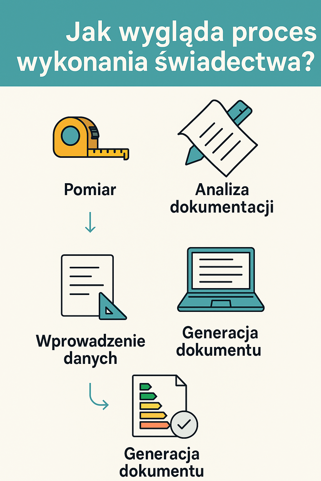 Wykonanie świadectwa nie jest automatyczną formalnością — to dokładna analiza konkretnego budynku. Cały proces składa się z kilku etapów: